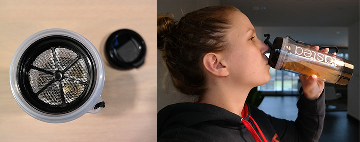 Bij de thee kreeg ik ook de handige Tastea theebeker. Een dubbelwandige reisbeker met ingebouwd filter. Door dat filter kun je de verse thee gewoon los in de beker gooien, zonder dat je tijdens het drinken theeblaadjes in je mond krijgt. Ziet er ook wel leuk uit, die ronddwarrelende blaadjes in het water. 🙂 En door de dubbele wand blijft de thee echt heel lang warm!